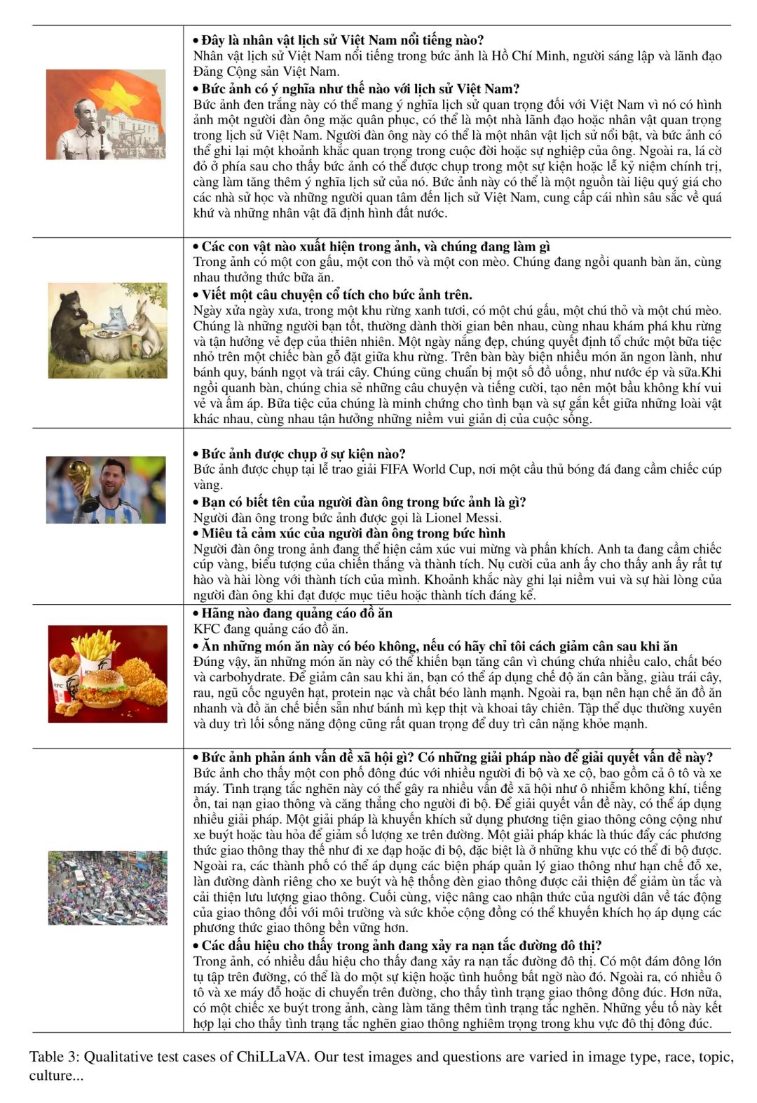此外,为了促进越南语MLLM的评价和比较,作者提出了LaVy-Bench基准。这个基准包括一个开放的VQA任务和一个野外测试集,专门设计用于评估MLLM在越南语和野外图像中的视觉语言理解和生成能力。通过建立标准化评估框架,作者旨在推动越南语MLLM的发展和基准测试,促进研究社区内的创新和合作。