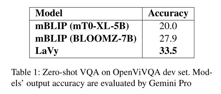 作者评估了模型在OpenViVQA Nguyen等人(2023)开发集上的零样本视觉问答(VQA)性能,该开发集包含3,505个样本。这个数据集挑战了模型对越南图像与自然语言之间关系的理解。此外,作者提出了一种新的自动评估指标,以取代如BLEU Papineni等人(2002年)等旧指标,后者不能准确反映模型在VQA任务中的能力。作者的指标受到LLM-as-a-Judge Zheng等人(2023年)的启发,它利用Gemini Pro来验证问题-答案对生成的响应的准确性。在表1中,可以看出LaVy的零样本VQA性能(33.5%)优于mBLIP-Bloomz-7B(27.9%)和mBLIP-mT0-XL-5B(20.0%)。然而,OpenViVQA数据集包含多种在作者的训练数据集中未出现的问题类型,例如OCR,这使得这个测试集对作者的模型来说尤其具有挑战性,更不用说作者的训练说明仅包括8,000张越南语抓取图像的描述了。