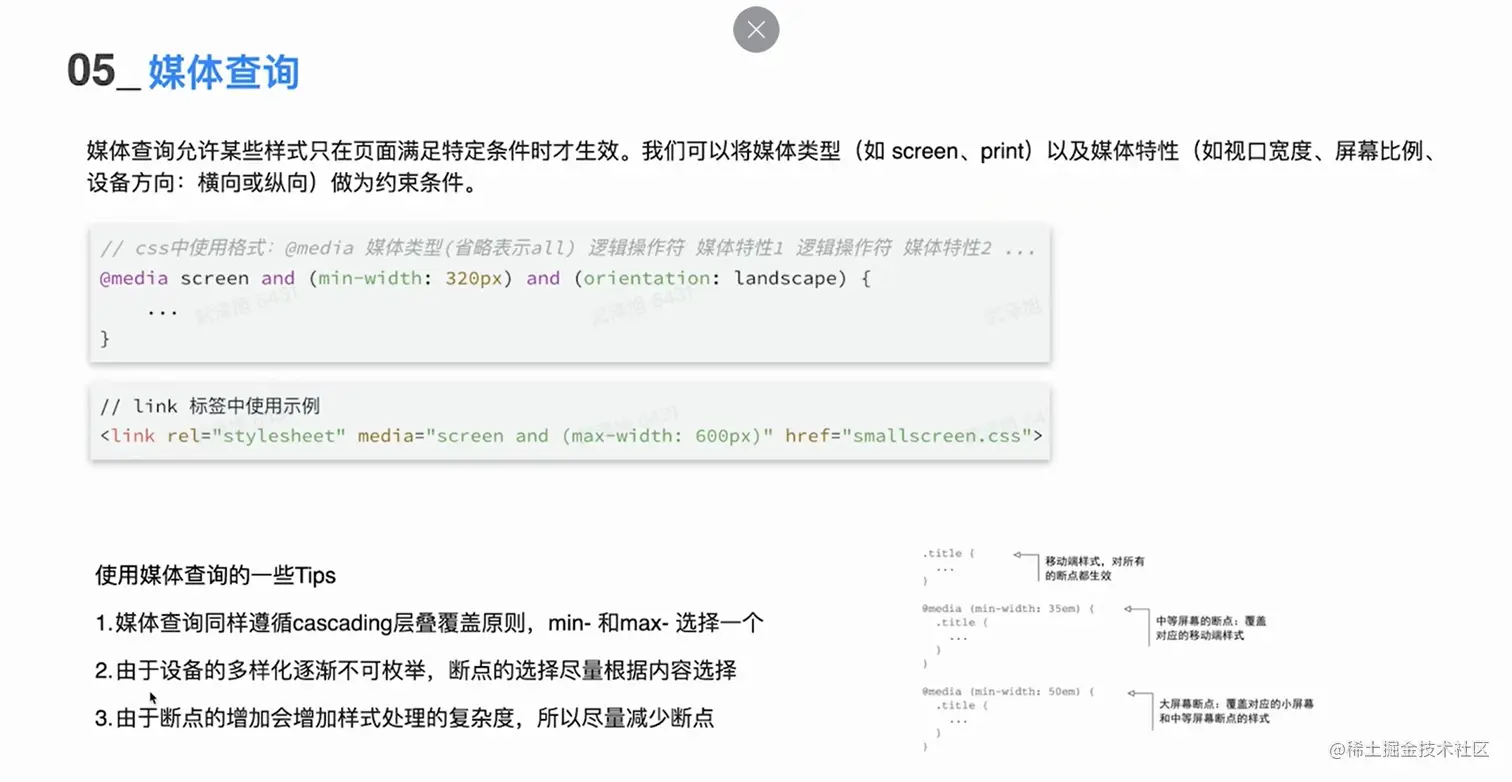CSS 媒体查询是一种可以根据设备类型或屏幕尺寸等特征,为不同的设备或尺寸定义不同的规则和样式表的技术。它允许我们为不同的设备提供定制化的布局,以更好地适应不同的设备和屏幕尺寸。在响应式设计中使用媒体查询非常普遍。