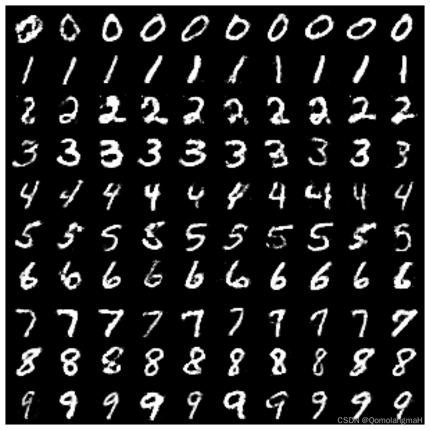 原始的GAN是无监督的,包括之前实验课上的DCGAN,其输出是完全随机的,在人脸上训练好的网络,最后生成什么样的人脸是完全没办法控制的。而CGAN则是有监督的GAN,在MNIST上以数字类别标签为约束条件,最终根据类别标签信息,生成对应的数字图像。