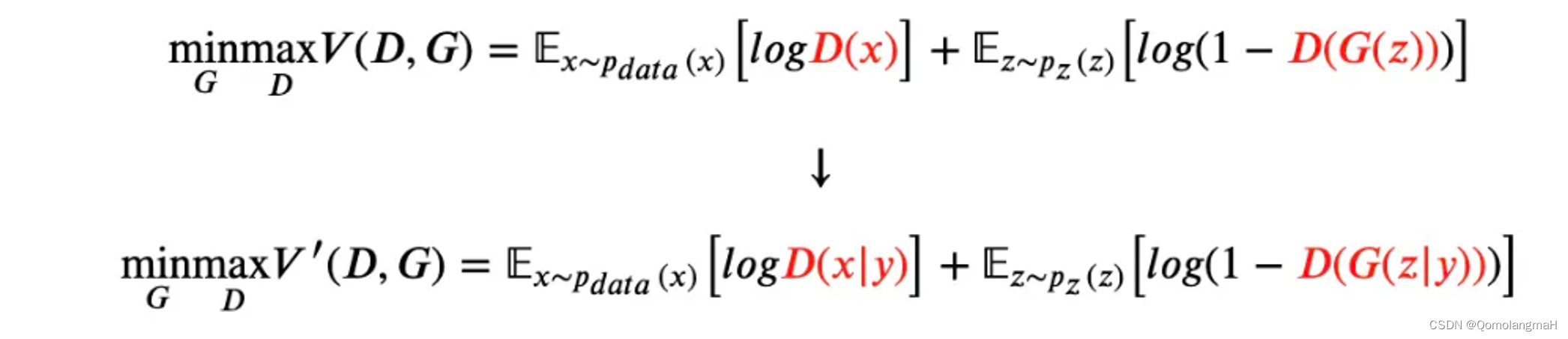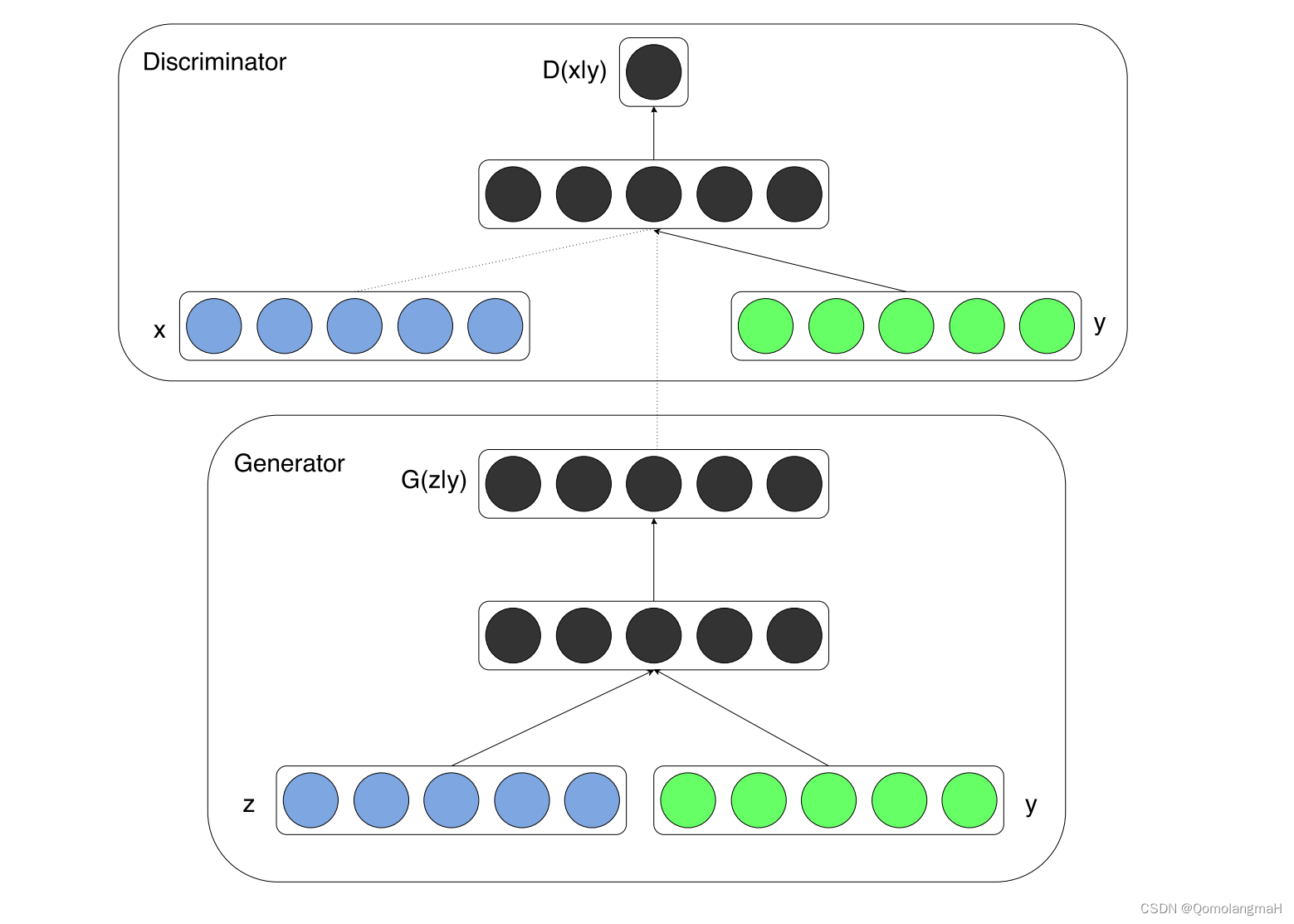 和原始GAN一样,CGAN还是基于多层感知器。在原始GAN中,判别器的输入是训练样本x,生成器的的输入是噪声z,而在CGAN中,生成器和判别器的输入都多了一个y,这个y就是那个额外条件信息。