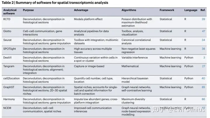 空间转录组学技术的快速发展要求开发分析方法,最大限度地从原始数据中提取生物学见解。空间转录组学数据输出大致可分为三类:空间背景下细胞类型的定位;空间可变基因(SVGs)的测定;建立功能相关的niche。为了实现这些数据输出,分析pipeline必须从细胞类型的分子定义开始,这是从文献或单细胞或单核RNA测序(scRNA-seq或snRNA-seq)数据中收集的,然后进展到标记转移,其中基于scRNA-seq(这里指的是scRNA-seq和snRNA-seq)数据的基因表达谱的细胞身份知识通过迁移学习在空间转录组数据中注释细胞。由于一些空间转录组学方法不是单细胞分辨率的(例如Visium和GeoMx),并且空间定位的mRNA由多个细胞贡献,因此可以使用反卷积方法来确定基于scRNA-seq数据的这些区域的细胞身份。每个细胞的空间识别依赖于分割,其中基于核或形态标记推断细胞边界,最终推断组织中每个细胞中的mRNA。