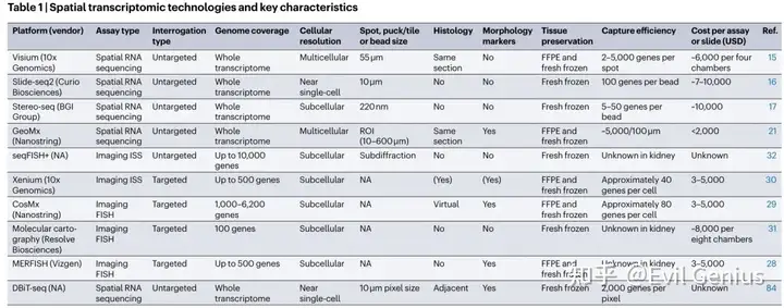 流行的ISC平台包括Visium, Slide-seq和Stereo-seq。标准Visium spot直径为55µm,可覆盖2~5个以上细胞,因此无法实现单细胞分辨率;然而,具有2 × 2 μ m方形无间隙探头的更高清晰度产品现在已经上市。Slide-seq提供接近单细胞的分辨率,spot大小为10µm,尽管单个spot可能覆盖两个或三个细胞,这取决于它们在组织内的细胞组织和大小。Stereo-seq提供RNA的亚细胞分辨率,spot大小为220 nm。然而,该技术衍生的cDNA必须在专有测序仪上测序,而不是在标准Illumina测序仪上测序。经验表明,在定位特异性和特征深度之间可能存在权衡,与使用具有较小spot大小的技术识别低水平表达的基因相比,更倾向于识别高表达的基因。