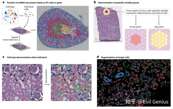 与scRNA-seq数据集相比,空间转录组数据可能缺乏可检测的基因数量或检测特定细胞的能力,这是由于杂交中使用的靶标或测序过程中从细胞中有效捕获mRNA分子的限制。在空间转录组学中,特定的细胞类型最常用的定位和鉴定方法是使用标签转移或反卷积策略,使用来自scRNA-seq数据的细胞类型注释。Seurat是scRNA-seq数据聚类最常用的工具,通过将每种细胞类型的特征定义为载体来定义细胞类型。然后,描述每个cluster的标签可以通过一个过程转移到组织中,这个过程本质上是选择最可能的细胞类型,这些细胞类型映射到空间转录组数据中的特定位置或细胞。Seurat版本5现在包含了各种空间转录组数据集的显示功能,例如Visium和CosMx。然而,其他工具,如Tangram, STELLAR, CellTrek, SPOTlight,RCTD和cell2location,也可用于推断组织内细胞或spot的细胞类型。其中许多方法已经在其他地方进行了运用。当spot覆盖多个细胞时,这些技术也可用于对来自不同细胞类型的特征进行反卷积。这些技术中的每一种都有不同的潜在数学性质,这可能导致细胞或spot的定义有相当大的差异。根据在测试多种方法和构建成人肾脏图谱方面的经验,在肾脏中,一些技术似乎导致某些细胞(如一些免疫细胞和插层细胞)的过度估计。因此,稳健的方法是使用两种方法(Seurat和CellTrek)来确认从scRNA-seq到空间转录组数据的细胞类型转移,并在可行的情况下通过潜在组织学进一步确认发现。