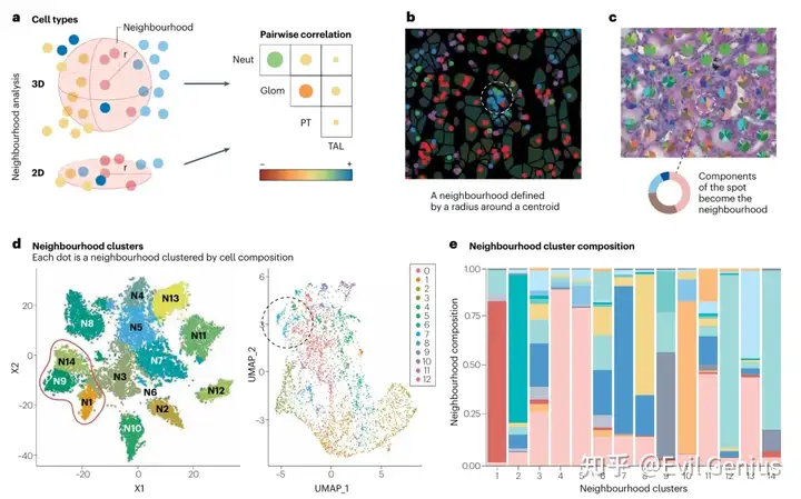 定义邻近区域的一种方法是使用细胞测量软件,如组织探索和分析,它可以帮助定义每个细胞中心周围的物理距离或半径,并量化半径内邻近的细胞。然而,任何细胞术或可视化工具都需要单细胞分辨率的空间转录组数据才能有效。对于像Visium ST这样的技术,每个spot覆盖多个细胞,每个单独的spot可以被认为是一个邻域。反卷积后,可以确定每种细胞类型表达的基因对每个spot的贡献比例,并使用它们的相对比例来确定该邻域的组成。该分析有助于量化组织中特定健康和病变上皮细胞的相对比例,这是一个重要的特征。在该图谱中,肾脏疾病患者活检样本中TAL邻域的量化显示,改变状态的TAL邻域相对增加。因此,邻域是比较不同组织中细胞分布和了解病理生物学的重要手段。
