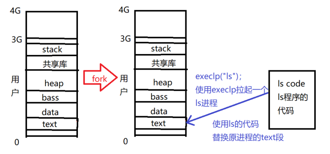 调用exec函数的时候,会把当前进程的 .text 和 .data 替换为所要加载的程序的 .text 和 .data ,然后让进程从新的进程的 .text 段的第一条指令开始执行,但是进程ID不变,也就是说壳子没变,但壳子里的东西变了。