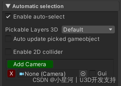 Add Camera:多相机的拾取。若不添加,则默认跟MainCamera关联。若添加某摄像机,位于其视口底下的物体也可被拾取