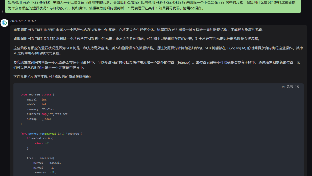vEB-TREE-INSERT 和 vEB-TREE-DELETE 函数中,首先检查元素是否已经存在或不存在。这可以通过遍历树或使用辅助的数据结构(如哈希表)来实现。以下是使用Go语言实现的带有元素存在性检查的 vEB-TREE-INSERT 和 vEB-TREE-DELETE 操作的示例代码:
