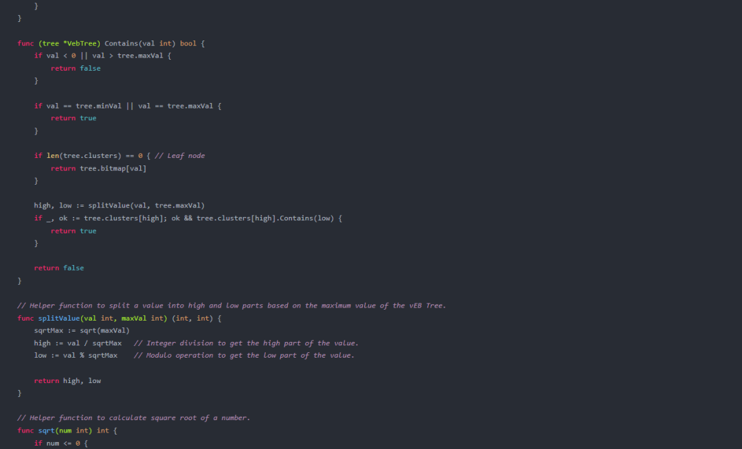 }这段代码实现了一个简单的 vEB 树,并添加了哈希表功能来实现常数时间的查找操作。
