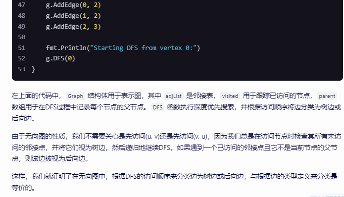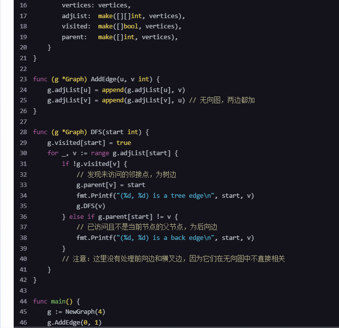 下面是一个使用Go语言实现的简单的DFS算法,用于对无向图中的边进行分类: