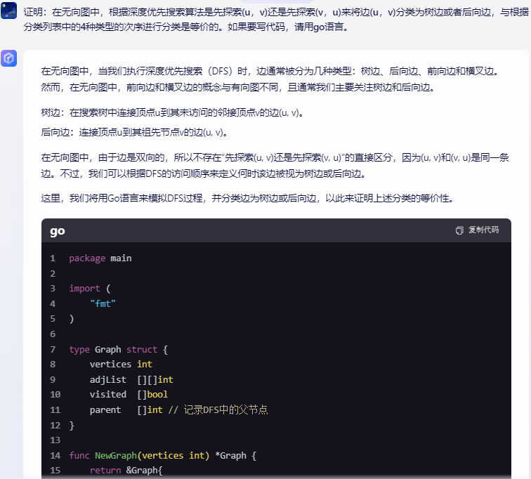 六、证明:在无向图中,根据深度优先搜索算法是先探索(u,v)还是先探索(v,u)来将边(u,v)分类为树边或者后向边,与根据分类列表中的4种类型的次序进行分类是等价的。如果要写代码,请用go语言。