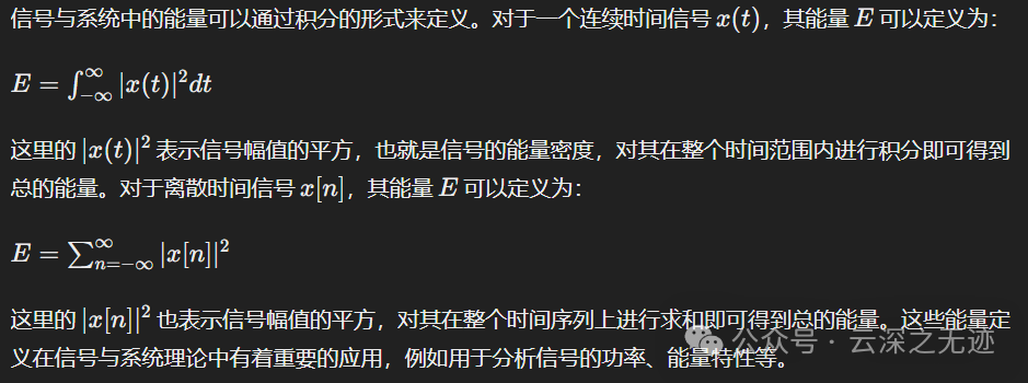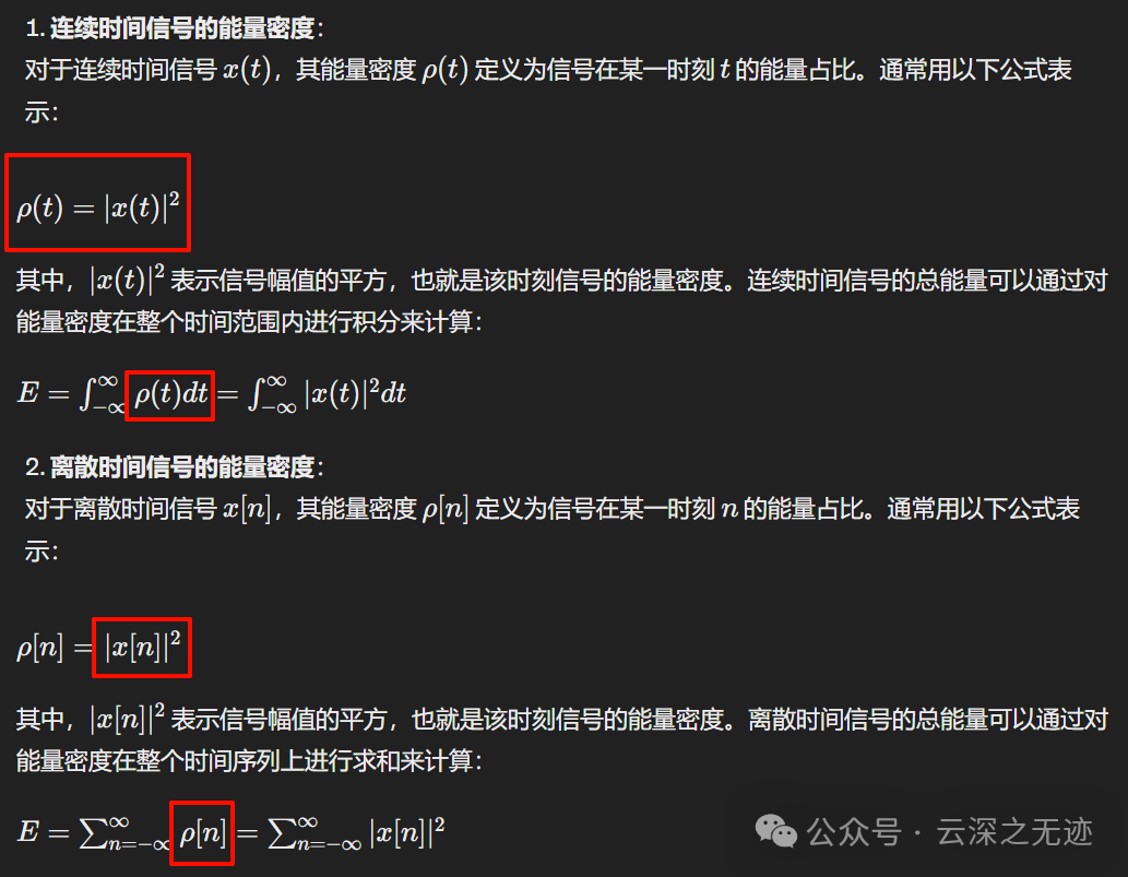 - 能量:能量表示信号在整个时间或时间序列上的总累积能量,它是存在的,并且不受时间的影响。即使信号的能量消失,其能量仍然存在,因为能量是对信号波动幅值的平方进行积分或求和得到的。因此,无论信号的波动如何变化,能量都是一个固定的值,代表了信号的总体能量状态。