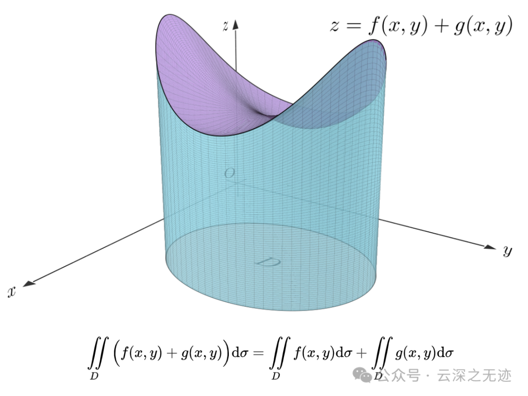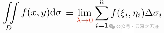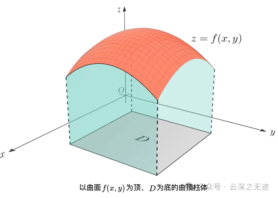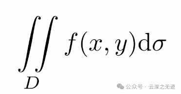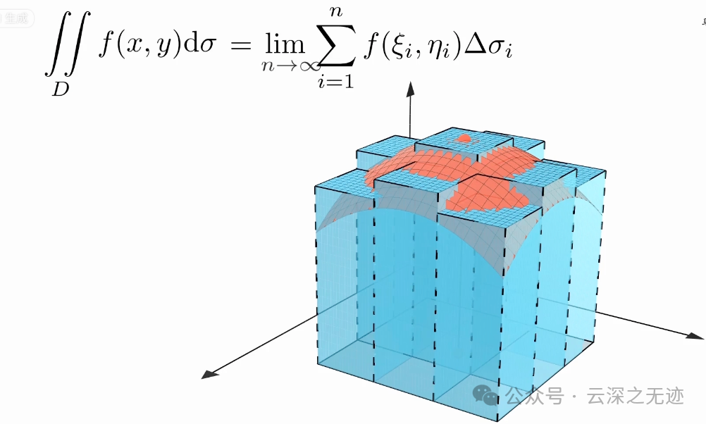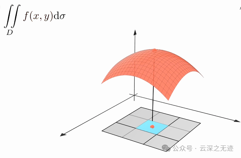 D 是下面的闭合曲面,d_sigma 是一个小格子的面积,和 f 一相乘就是一个小柱体的体积。前面两个 SUM 符号就是一个二重积分的标记。