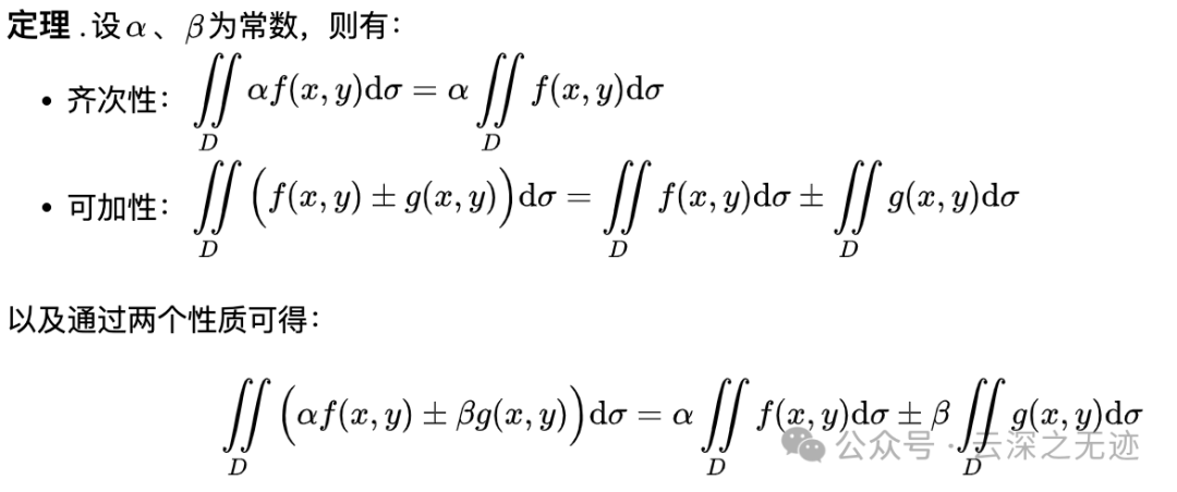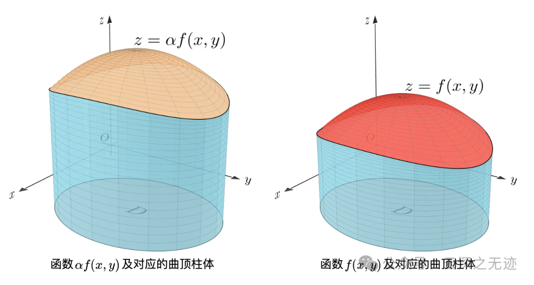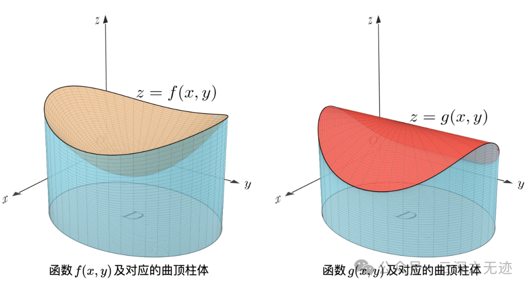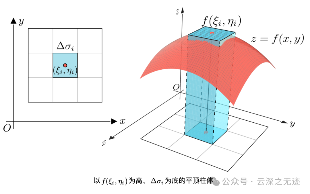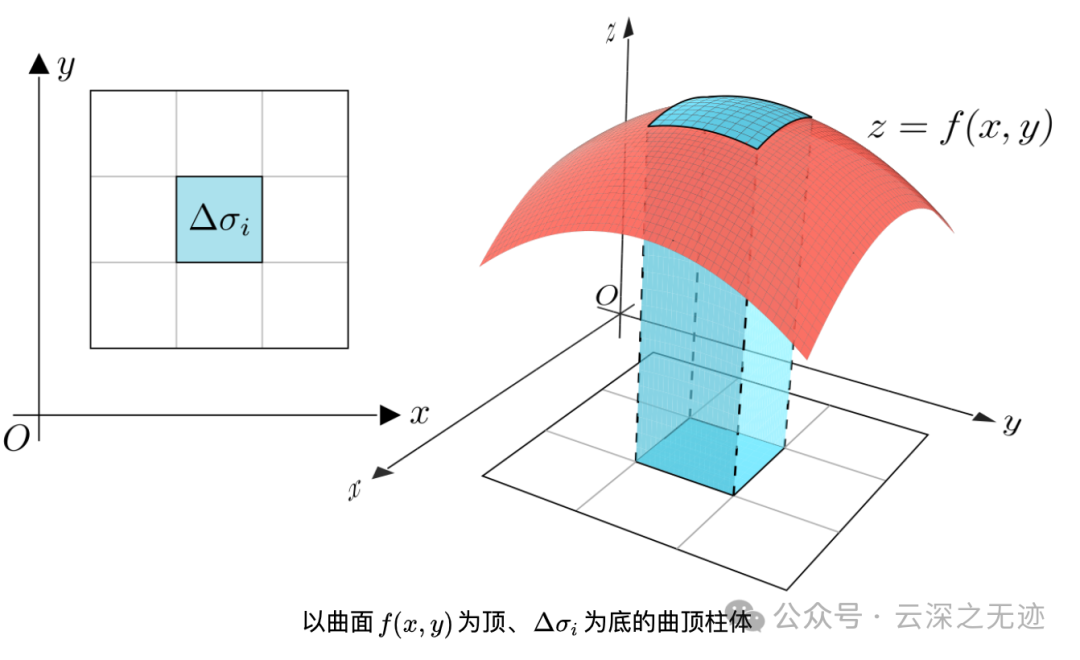 D 是下面的闭合曲面,d_sigma 是一个小格子的面积,和 f 一相乘就是一个小柱体的体积。前面两个 SUM 符号就是一个二重积分的标记。