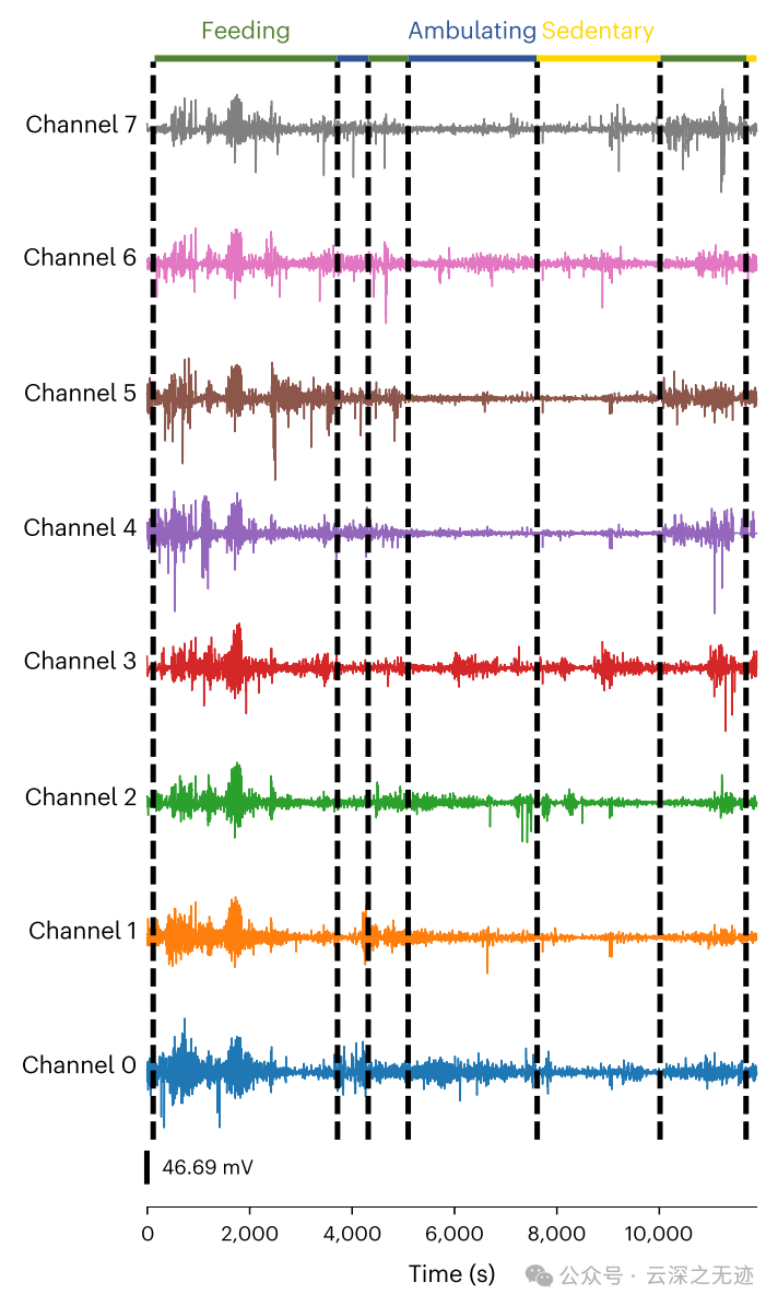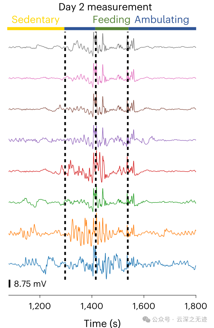 此外,系统可以区分药物引起的运动变化,并在动物喂养和移动期间测量高质量的粘膜胃慢波,无需任何束缚或可穿戴系统。这些结果说明了长期研究胃电生理学的潜力,以及在不受受试者运动、进餐或日常生活限制的情况下获得高质量记录的策略。