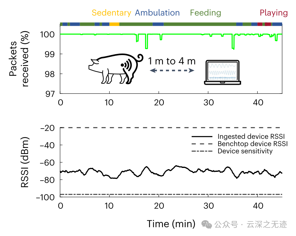 在自由活动的猪(97 公斤)中,使用距离设备约 1-4 米平板天线,发现外部 915 MHz 收发器可以在饱腹和多种行为期间可靠地接收来自 MiGUT 系统的 99% 以上的数据,功率约为 -70 dBm。
