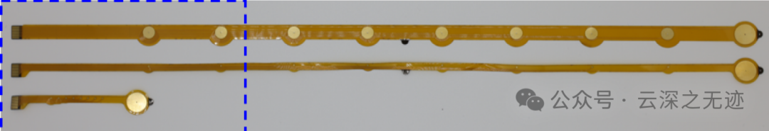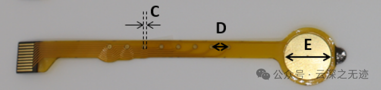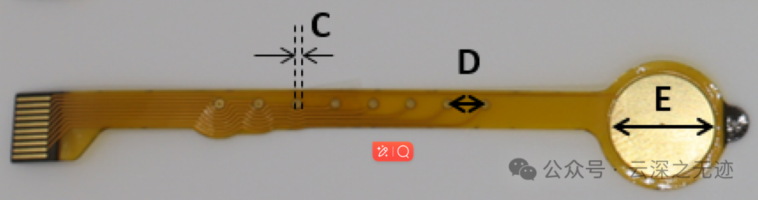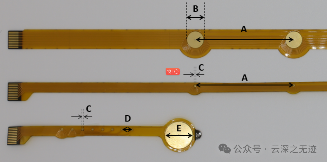 还制造了另一种配置,其中参考电极最靠近 FFC 接口,以方便放置设备。‘中’电极尺寸相似,但使用直径为 0.8 毫米的测量电极,参考电极配置和间距与大电极相同。‘小’电极使用直径为 0.8 毫米的电极,间距为 3 毫米,接着是 8 毫米参考电极。