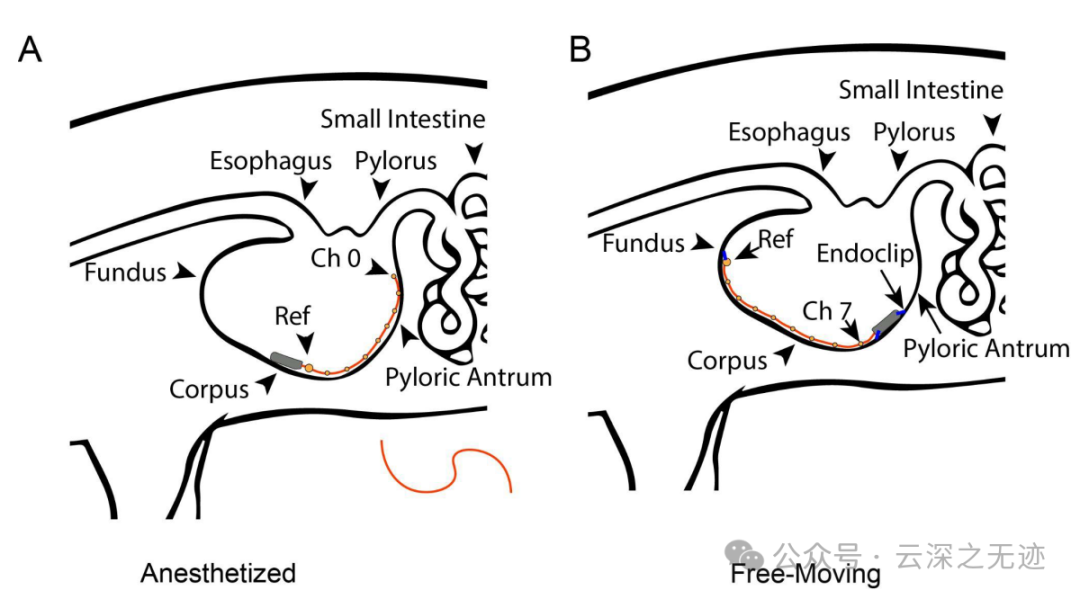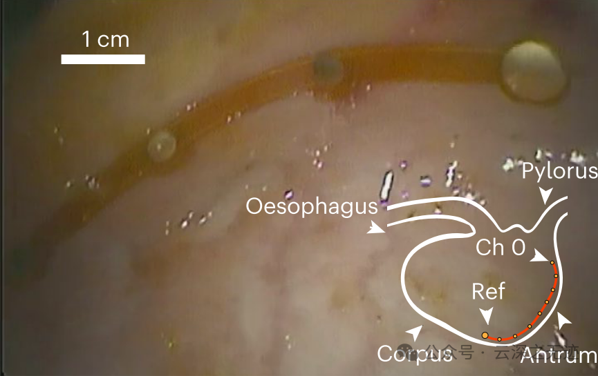a,在麻醉测量中,装置放置在靠近体体的地方,参考电极最靠近装置,电极与胃的大弧度-致,直到幽门窦。