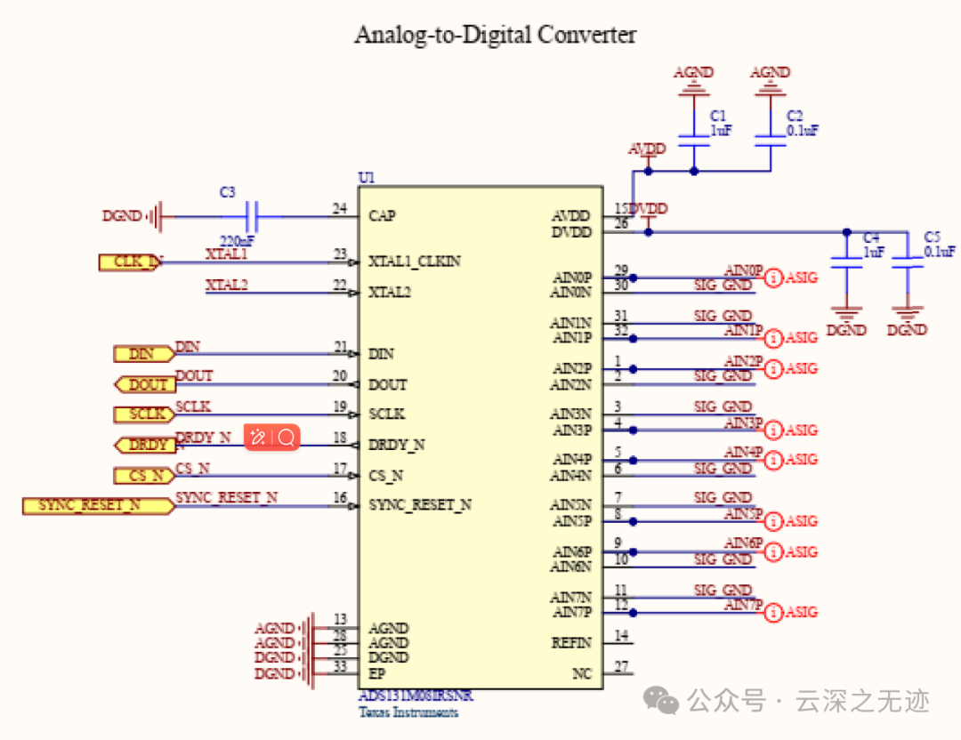 使用现成的八通道同步 delta-sigma ADC 来数字化生物电势。所有通道共享相同的参考,这些参考连接到 FFC 接头的参考引脚。当提供 2.048 MHz 时钟时,ADC 可以以 62.5 Hz 至 8 kHz 的采样率数字化所有通道,精度为 24 位或 16 位。
