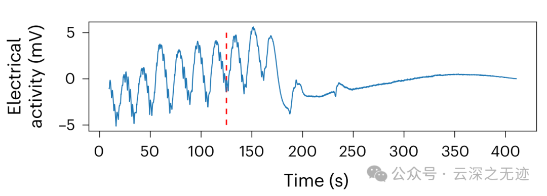 通过巴比妥类药物混合物对动物实施安乐死后通道中的电活动停止(输送时间用红色虚线表示)。