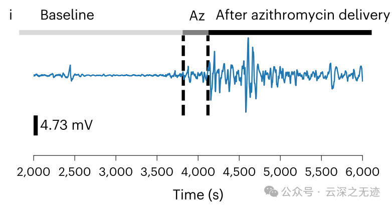 代表性通道显示麻醉动物在注射阿奇霉素之前和之后的电活动(0.01–0.25 Hz 带通滤波器)