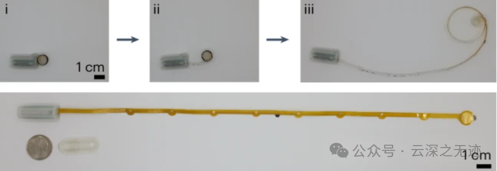 该系统被称为通过可摄入、胃部、不受束缚的追踪的多模式电生理学 (MiGUT),包含封装的电子设备和电池,以及以卷起配置存储的传感电极带。