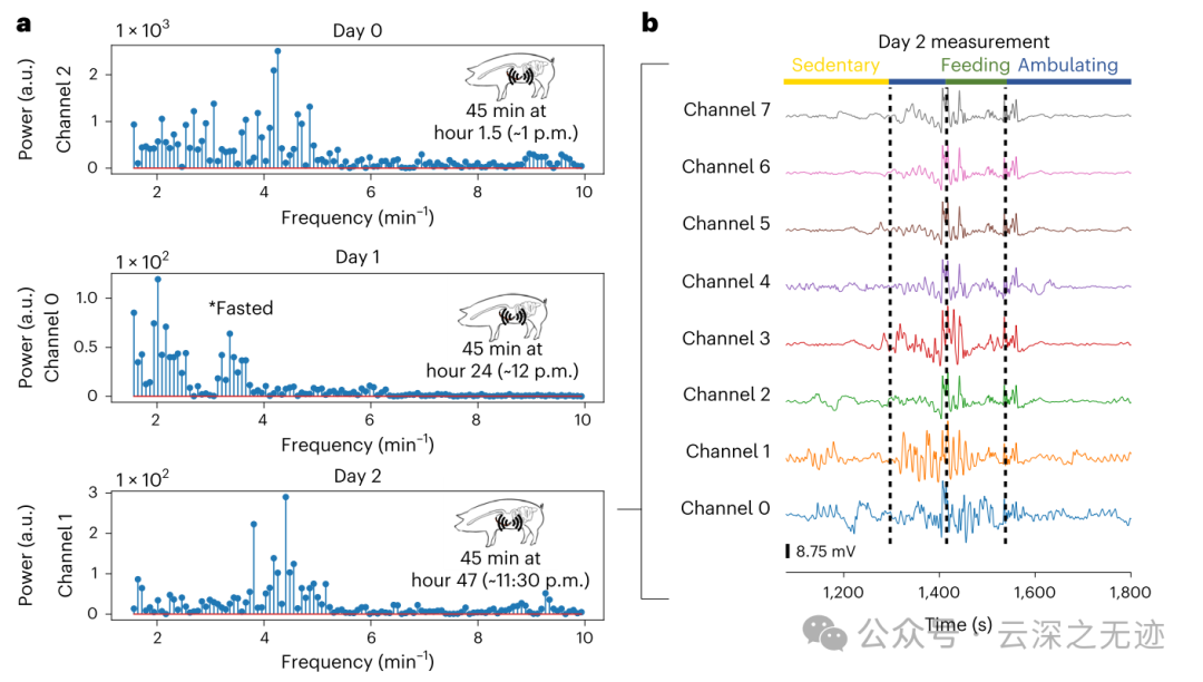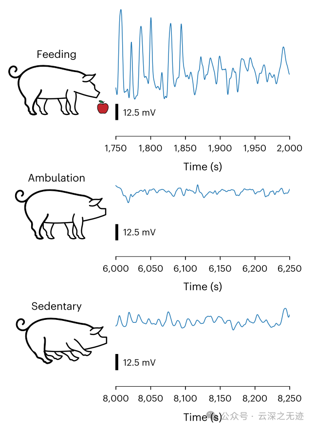 在自由活动的动物进食、走动和打盹活动期间,将 MiGUT 设备固定在猪胃内(0.01–0.25 Hz 带通滤波器),进行 3.5 小时的八通道记录。