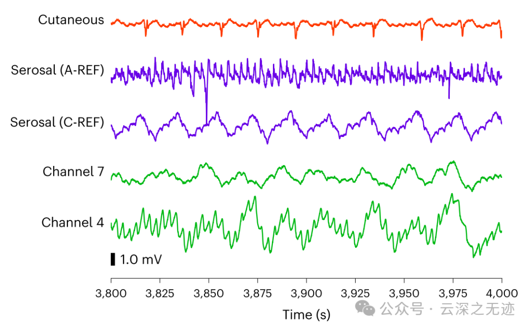 波形形状的差异可归因于粘膜和浆膜表面的电极放置位置以及电极的相对位置的变化。有趣的是,数据还显示了参考选择对于记录胃慢波的重要性,因为放置有内部参考的浆膜电极无法测量胃慢波,可能是由于腹腔内其他器官的噪音。