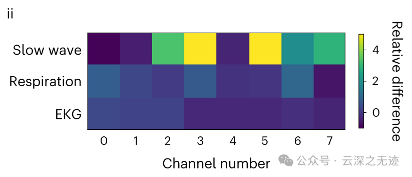 (i),热图显示阿奇霉素注射前后慢波(0.01–0.25 Hz)、呼吸(0.25–5 Hz)和心电图(5+ Hz)频率窗口内信号功率的相对差异