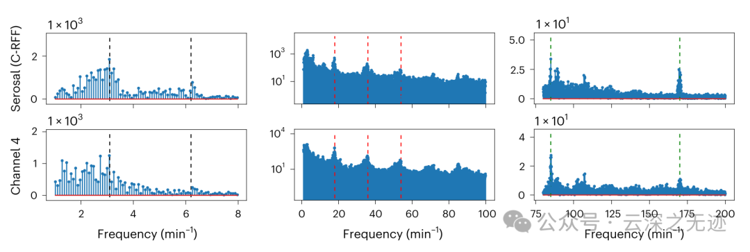 一系列频率下对浆膜电极和 MiGUT 记录通道进行 FFT 比较,虚线表示慢波(黑色,每分钟 3.1 个周期)、呼吸(红色,每分钟 18 个周期)和心电图(绿色,每分钟 85 个周期)频率的主频率和高阶峰值。