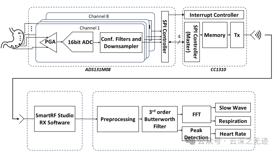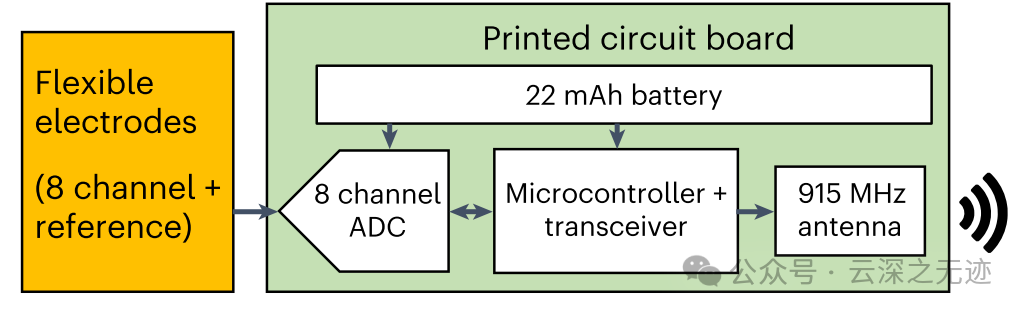 使用八通道、16 位模数转换器 (ADC) 测量生物电,并使用集成 915 MHz 收发器的微控制器将其无线传输到基站。