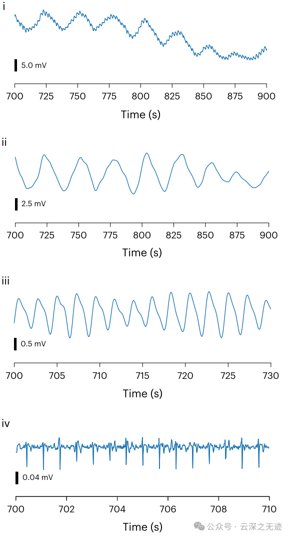 (iii),“心电图尖峰”频带从 5+ Hz(iv)。