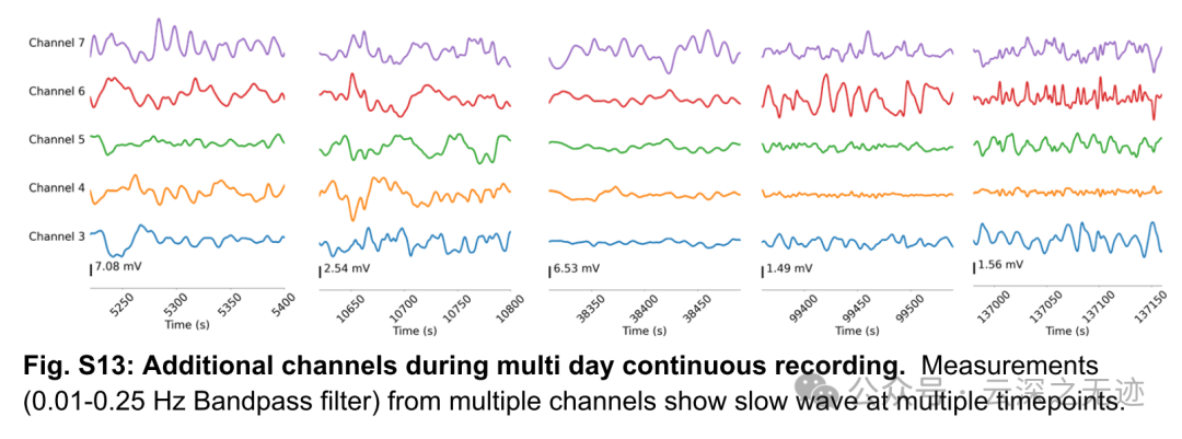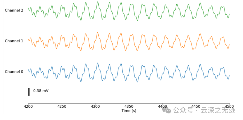 通道 0、1 和 2 的电压与时间清除幽门,显示周期约为 500 秒的大波,推测与 MMC 活动有关。