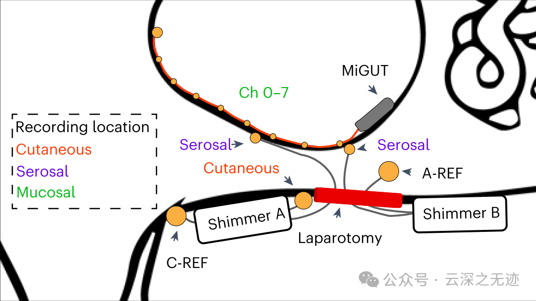使用口服 MiGUT 系统、带有皮肤和浆膜电极以及远离胃的外部皮肤参考的 Shimmer3 商业系统和带有浆膜电极和内部腹部参考的另一个 Shimmer3同时记录的示意图。浆膜电极和腹部参考是在剖腹手术后放置的。