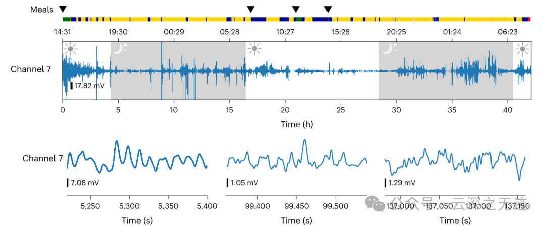 显示的通道 7在进食、走动和睡眠期间的胃电活动代表性片段。