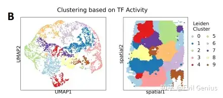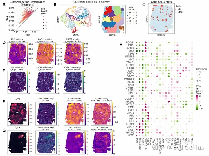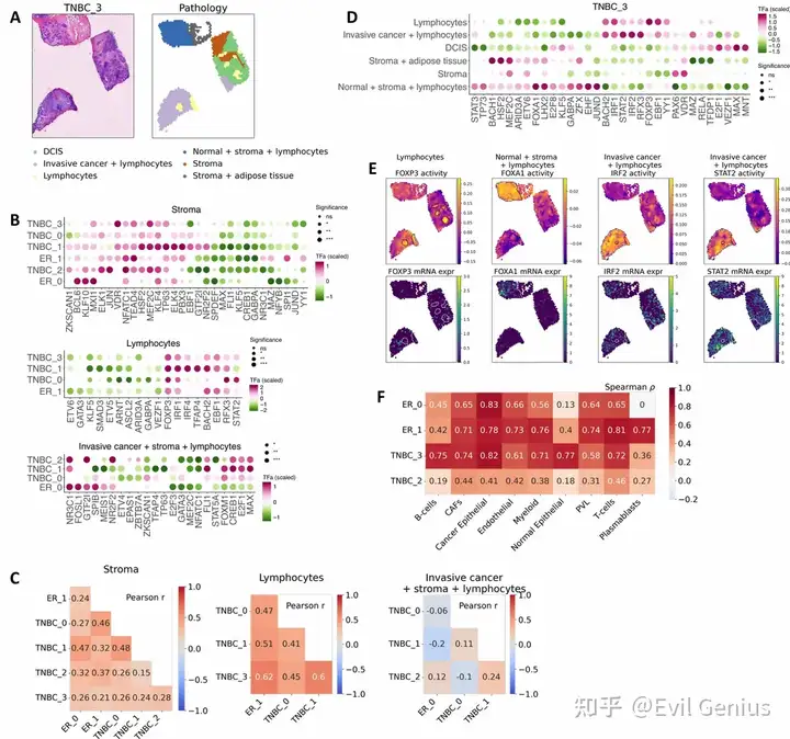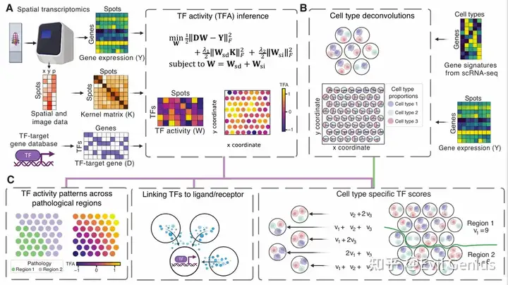 分析基于spot的ST数据集,以估计spot特异性TF活性,并识别与特定细胞类型、空间结构域、病理区域和配体/受体相关的TF。大多数基于spot的ST分析方法的一个关键限制是缺乏单细胞分辨率,因为空间RNA-seq测量结合了多个细胞。因此,推断TFs的点特异性活性来自多个细胞。为了克服这一限制,使用反卷积方法,通过计算整合空间RNA-seq与从scRNA-seq谱中获得的细胞类型的参考转录组特征来估计每个spot的细胞类型比例,通过线性回归进行TF和细胞类型之间的关联分析,通过反卷积方法从细胞类型比例单独预测每个TF的活性,以确定其活性在病理区域和空间域中不同的TF,并确定其基因表达与邻近位置的TF相关的配体/受体。