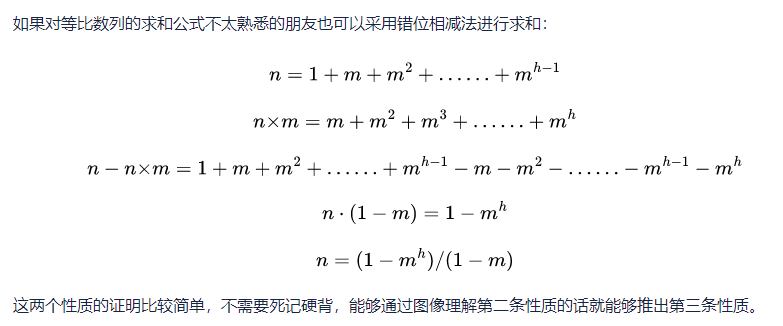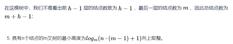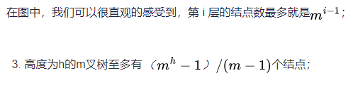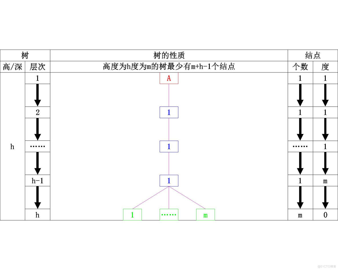 这条性质的第一点这里我们就不需要再次证明了,我们来看一下性质的第二点,高度为h,度为m的树,在结点最少的情况下就是只有一个结点的度为m,其它结点的度都为1,如下所示: