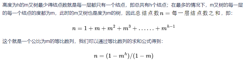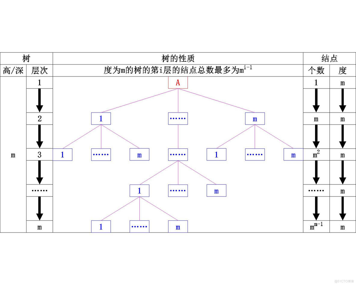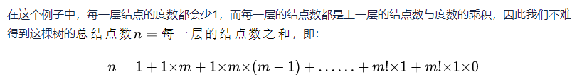 在最多的情况下该树的每一层的每一个结点的度都为m,因为每一层的结点数都是上一层的结点数与度数的乘积,而这棵树中所有的结点的度数都为m因此从第二层开始,每一层的结点数都是上一层的结点数×m,如下所示: