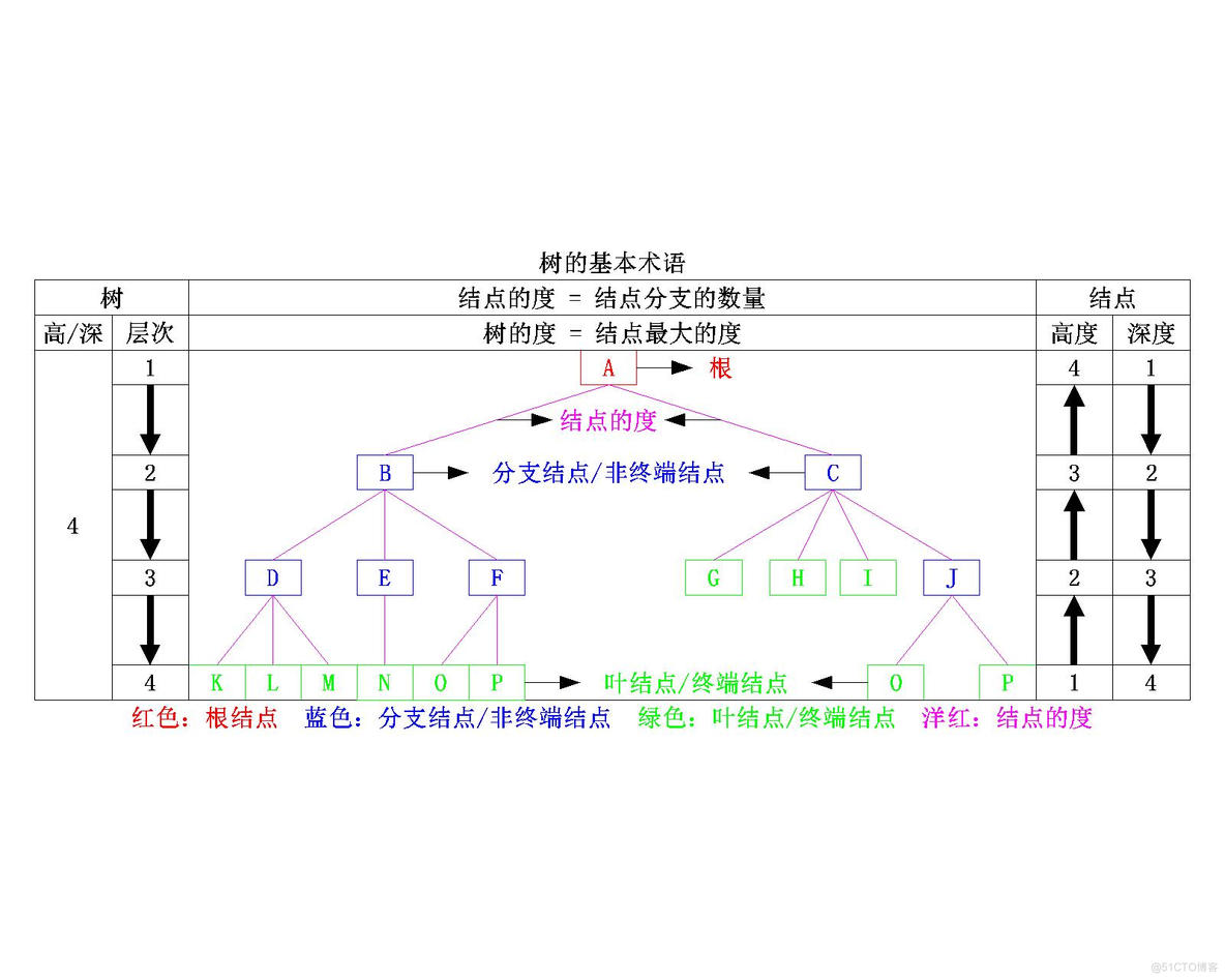 结点的度:树中的一个结点的孩子个数称为该结点的度; 树的度:树中结点的最大度数称为树的度; 分支结点:度大于0的结点称为分支结点,又称非终端结点; 叶结点:度为0的结点称为叶结点,又称终端结点; 结点的层次:从树根开始定义,根结点为第1层,它的子节点为第2层,以此类推。 结点的深度:从根结点开始自顶向下逐层累加; 结点的高度:从叶结点开始自底向上逐层累加; 树的高度(或深度):树中结点的最大层数。
