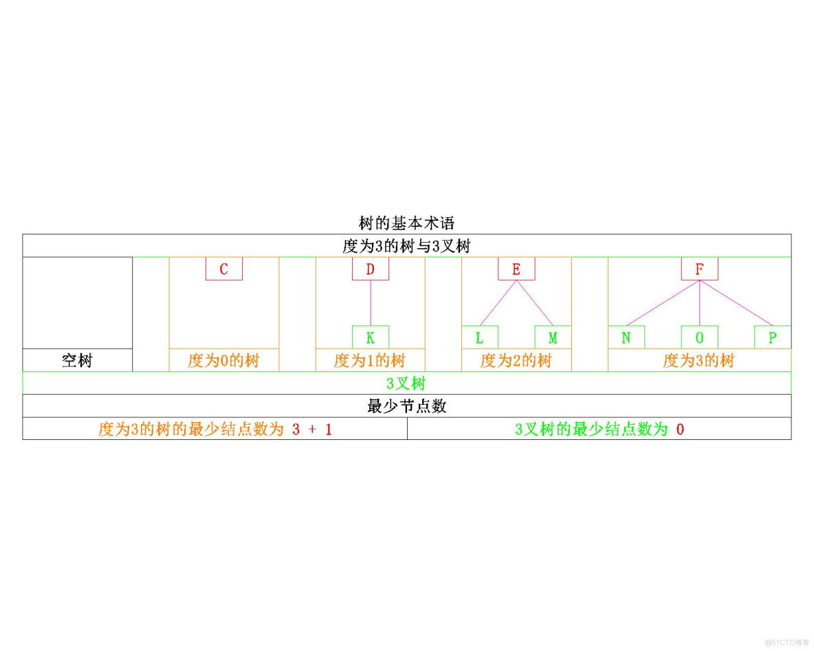 从集合的角度来理解它们二者的区别的话,我们可以认为度为m的树是m叉树的子集。以3叉树为例,在上图中可以很直观的看到,3叉树包含空树、度为0的树、度为1的树、度为2的树以及度为3的树;