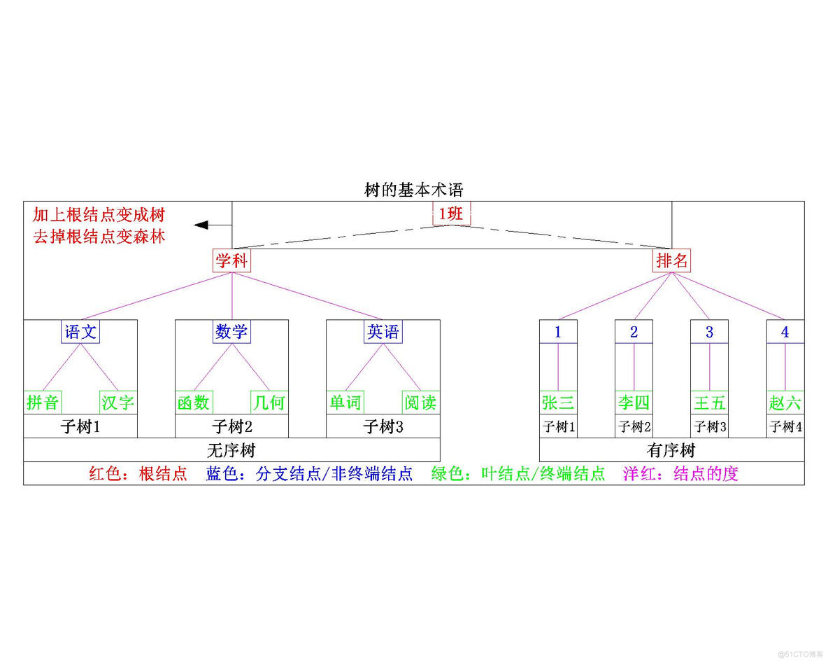 有序树:树中结点的各子树从左到右是有次序的不能互换; 无序树:树中结点的各子树从左到右是无次序的可以互换; 森林:m(m>=0)棵互不相交的树的集合。
