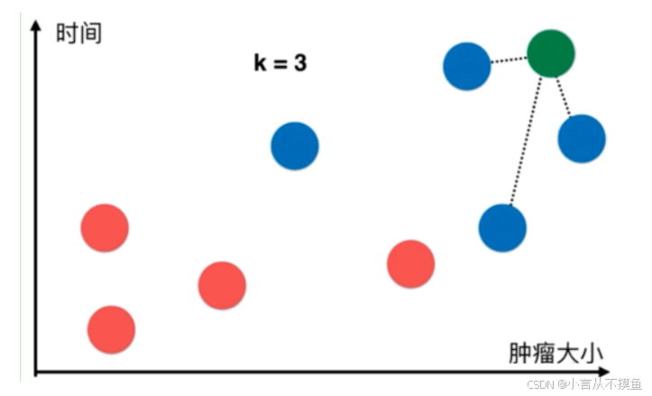 疑问:新来了一个病人(下图绿色的点),如何判断新来的病人(即绿色点)是良性肿瘤还是恶性肿瘤?