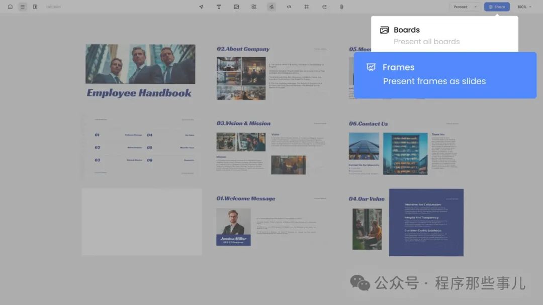 Noteey 是少数支持演示模式的视觉笔记应用之一。用户可以在演示模式中展示自己的知识和想法,与他人分享,实现知识的互联和共享。