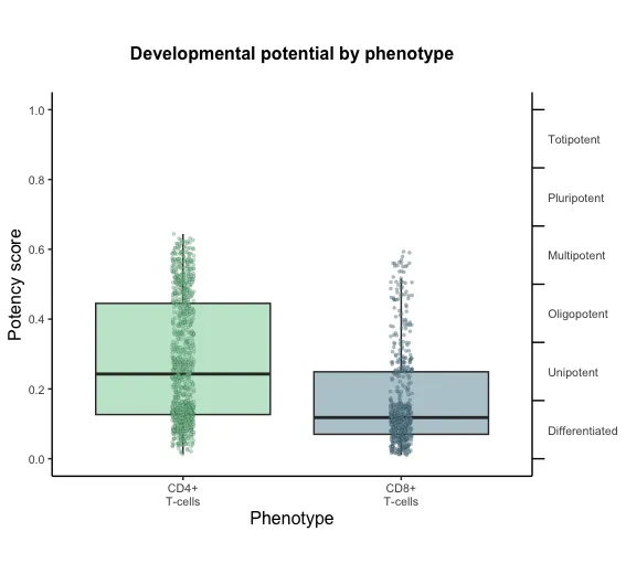 CytoTRACE2_UMAP展示了不同细胞的预测打分,按照颜色进行了划分。越是红色越靠近全谱系的分化状态,而越是接近蓝色则靠近已经分化完成的状态。这与上面的Phenotype_UMAP图结果是基本符合的,CD8+T细胞是目前已经认识明确(相对地)的一种功能性T细胞,而这里的CD4+T细胞有很多不同功能/阶段的亚群。