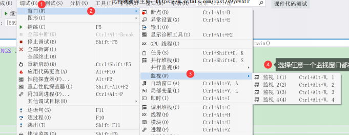 开始调试后,在菜单栏中【调试】->【窗口】->【监视】,打开任意⼀个监视窗口,输入想要观察的对 象就行。 打开监视窗口: