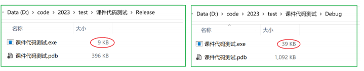 对比可以看到从同⼀段代码,编译生成的可执行文件的大小,release版本明显要小,而debug版本明 显大。