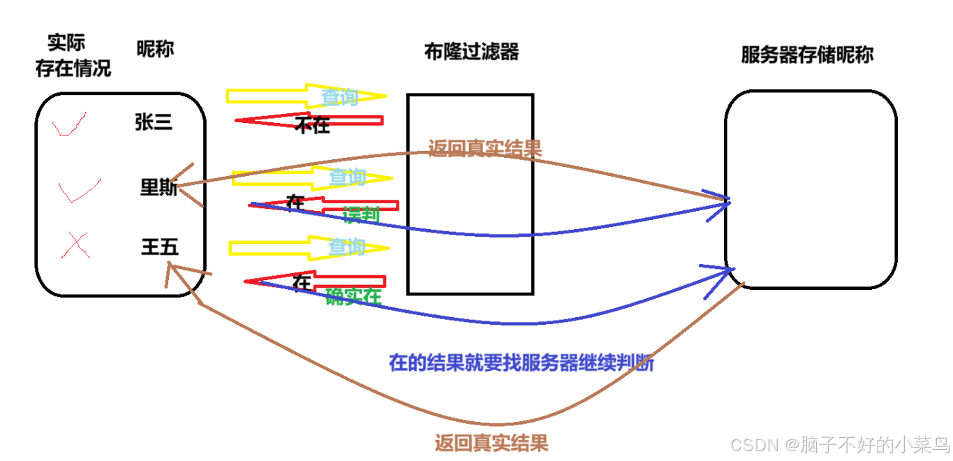 ✦ 对于不在的情况,就不需要再去服务器查找了,直接就可以返回 ——————> 判断不存在时是准确的 ✦ 对于在的情况,就需要再去服务器查找了,确认后再返回 ——————> 判断存在时是准确的,但是,如果不去服务器查找,也是可以的,因为这种误判存在的情况,并不影响运行结果(它并不会导致昵称重复而出错)-------> 这种情况是接受误判的