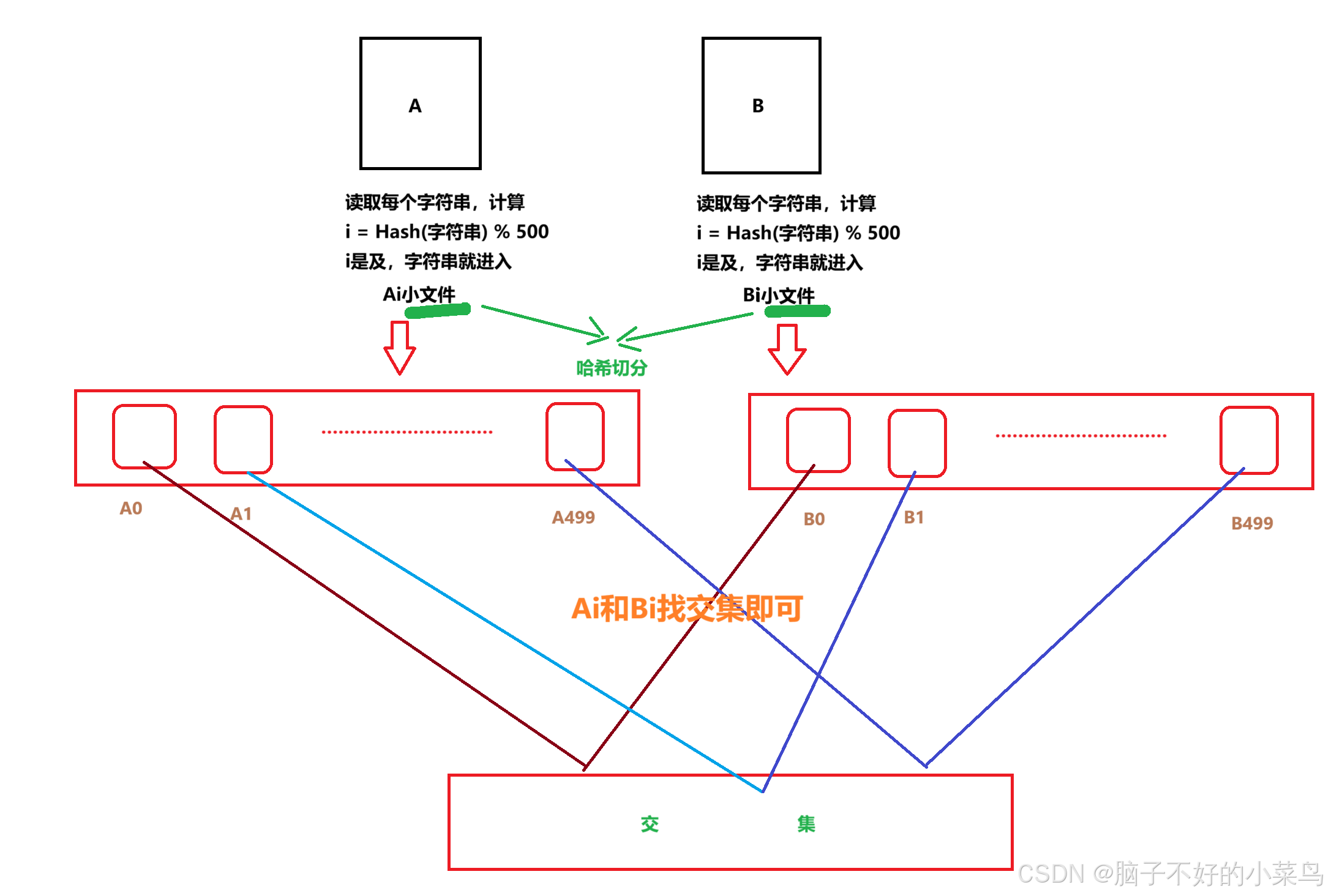 第一种情况很好解决,将读取到的字符串放到set即可(set会去重),Ai和Bi分别放到setA和setB中,再找交集 第二种情况会出现:不断插入set以后,内存不足,会抛异常,这个时候就需要换一个哈希函数,进行二次切分,再找交集