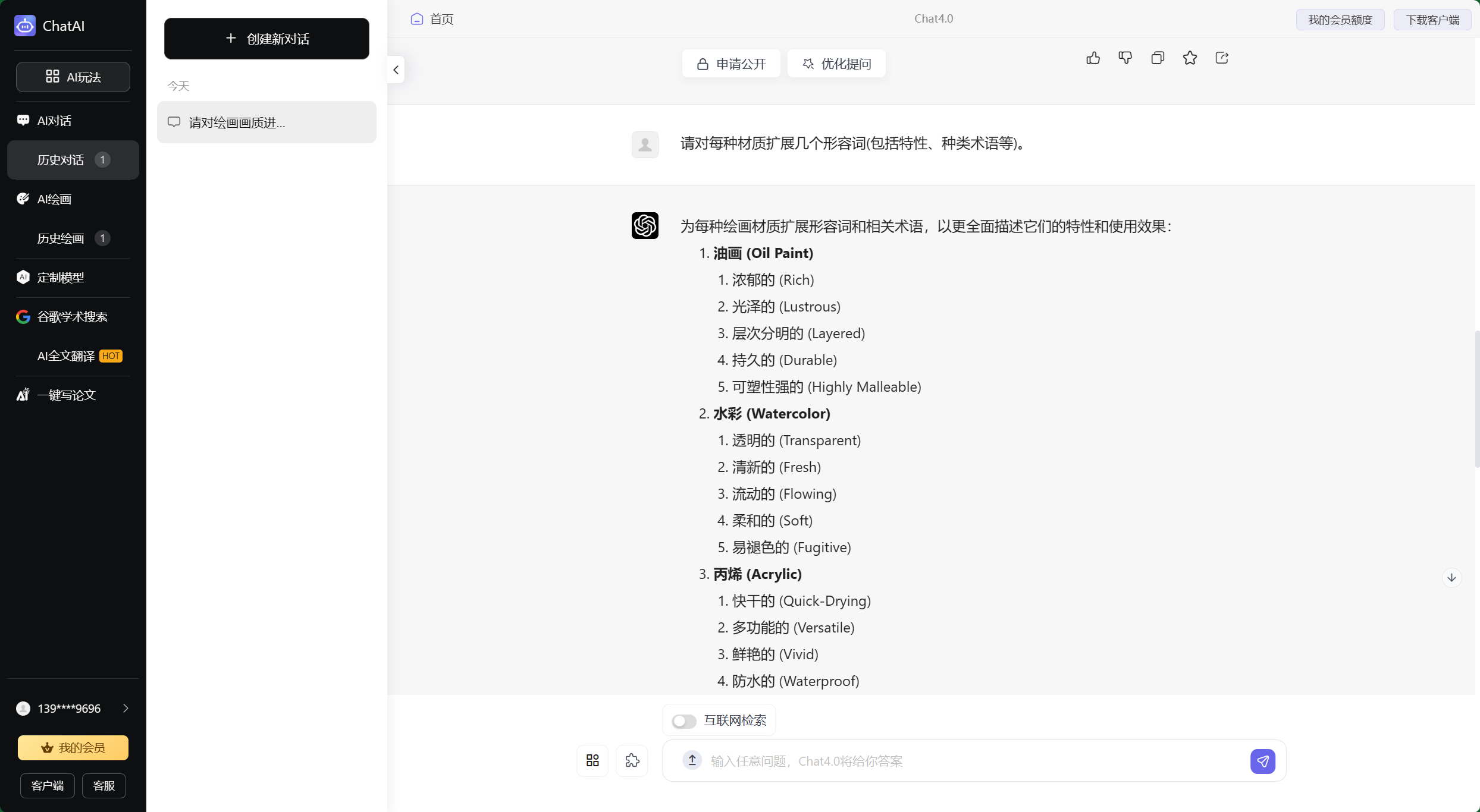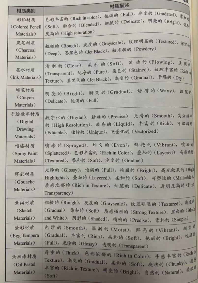 为每种绘画材质扩展形容词和相关术语,以更全面描述它们的特性和使用效果: