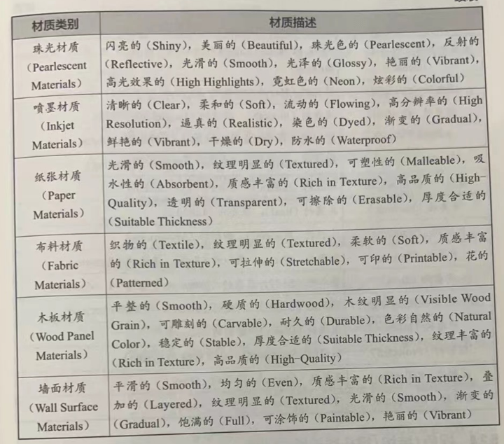 提示词:请对每种材质扩展几个形容词(包括特性、种类术语等)。